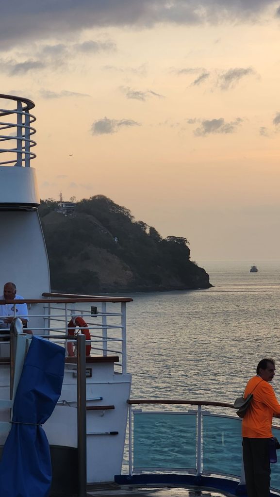 We took a break for about 3 hours in our cabin and watch the “Front of the Ship Show”. Once we could see that we were cleared for entrance then went back outside to see us go through the second set of locks on the Atlantic side. The Pacific side raised us from sea level to lake level then we traversed the lake and it took about 4 hours to get from lock to lock. Then the atlantic side has locks that lowered us to sea level. All in all it was an amazing and something everybody needs to experience.