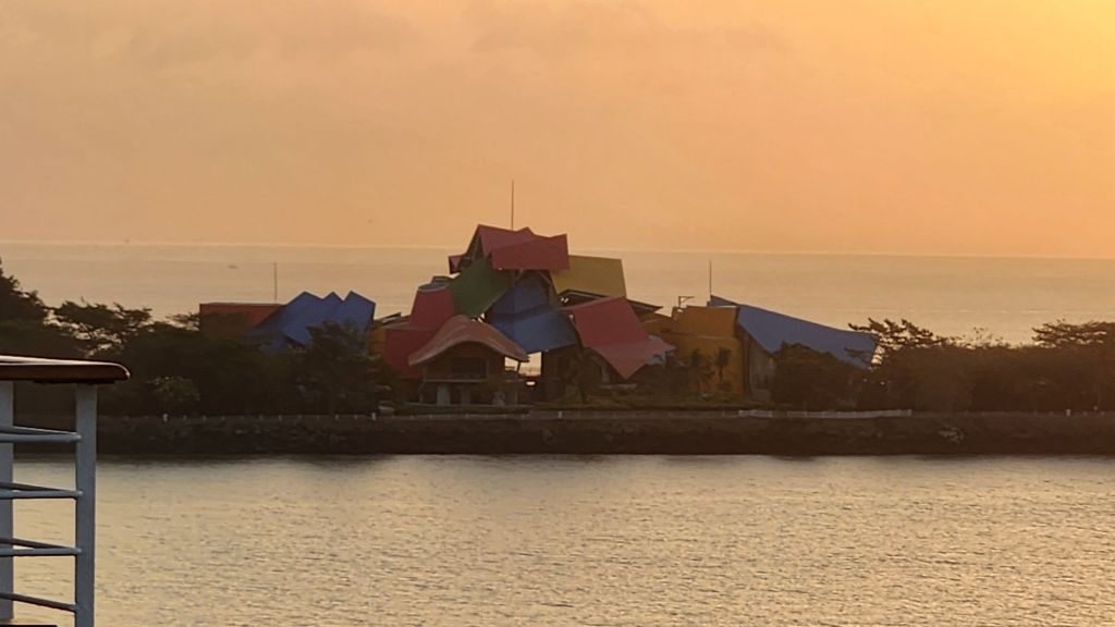 We were up at 5:00 a.m. to snag the perfect spot. We got a spot towards the back because we were told it was a great place to see the first set of locks. We got to see us go under the Bridge of the Americas. I got a great picture of it over us with the ship in the foreground. We got to see the skyline of Panama City. The sunrise and we got to see a bunch of super famous sites in Panama before we even made it into the locks.