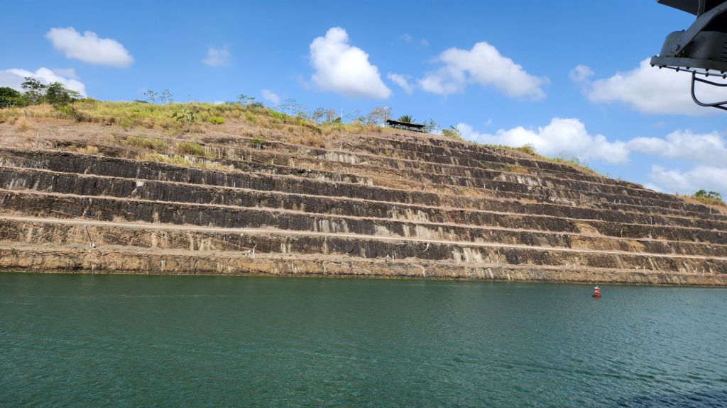 After we clear the first three set of locks we watched a little bit longer as we made it through the man-made area and I got some beautiful pictures of the cutouts on the side where they used explosives to dig the connection from the Pacific to the lake.