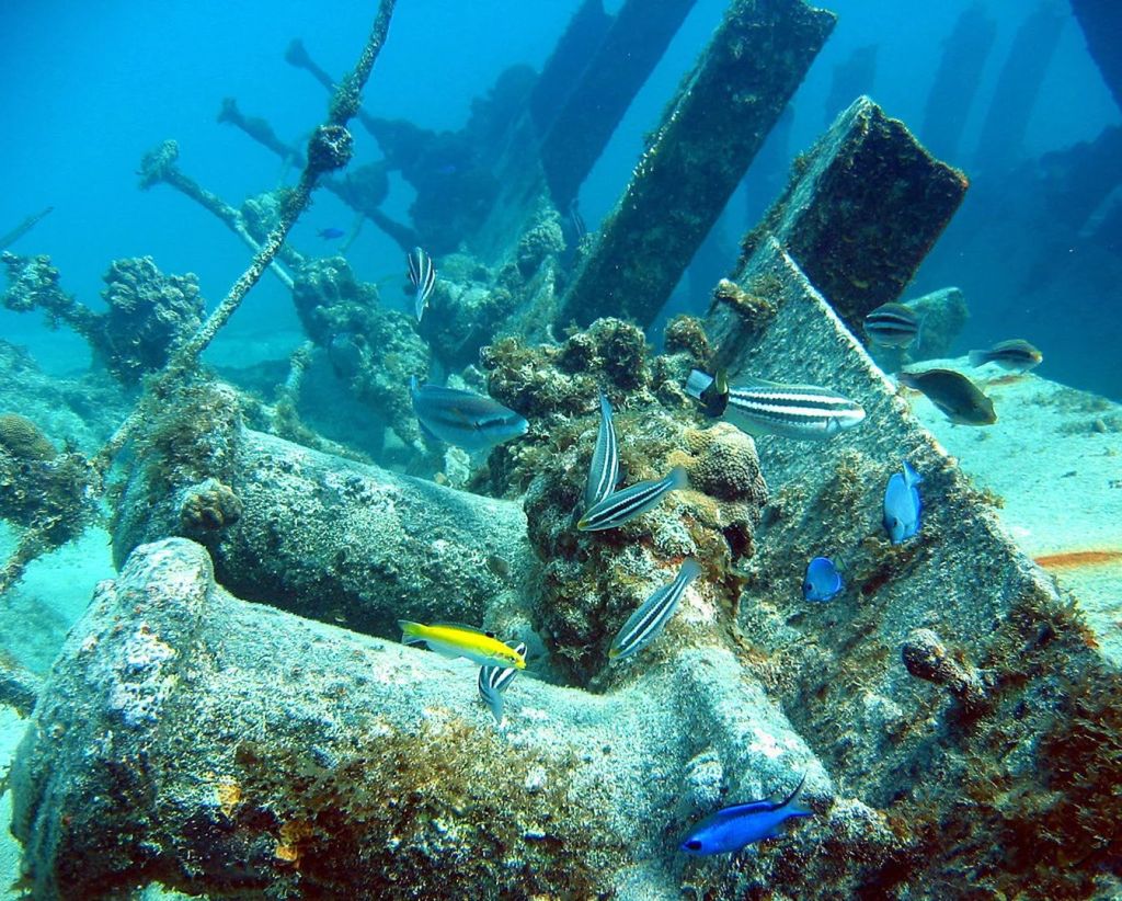 Less than 70 yards from shore in 30 feet of crystal clear water lies the Wreck of the Cali. The Cali was a four-mast schooner and was 220 feet long It sunk in 1944 after experiencing severe weather conditions. Since it was declared a hazard to navigation, she was blown up shortly after her sinking. The ship’s ribs are now exposed and scattered along the ocean floor along with winches, boilers, hull plates all nicely encrusted with sponges and corals. The wreck is also home to a diversity of other marine life including many species of tropical fish and a resident population of silver Tarpon.