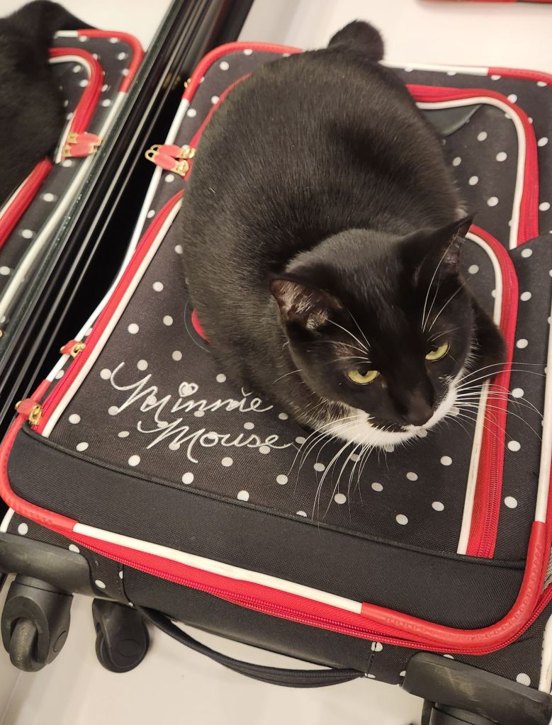 Travel day!! My kitty cat Minnie Mouse was helping me pack in my Minnie mouse suitcase.
